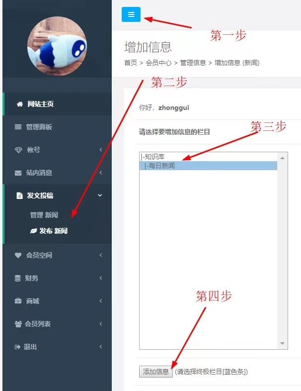 点击进入会员中心,按下图操作 http://118fang.com/e/member/login/